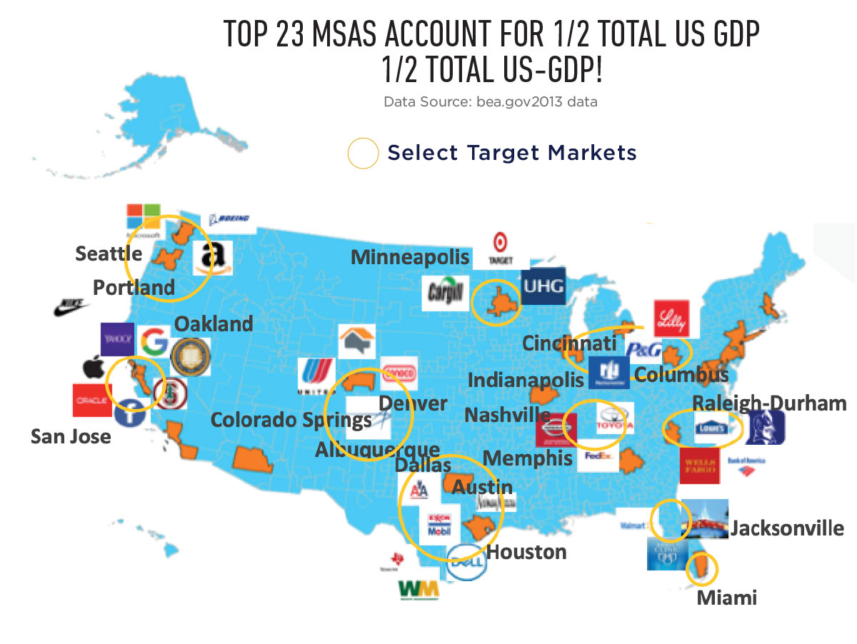 Our top down analyses always keys on population growth. We first seek out the country’s top MSA’s in terms of both raw and percentage projected positive population change from 2015 – 2030.