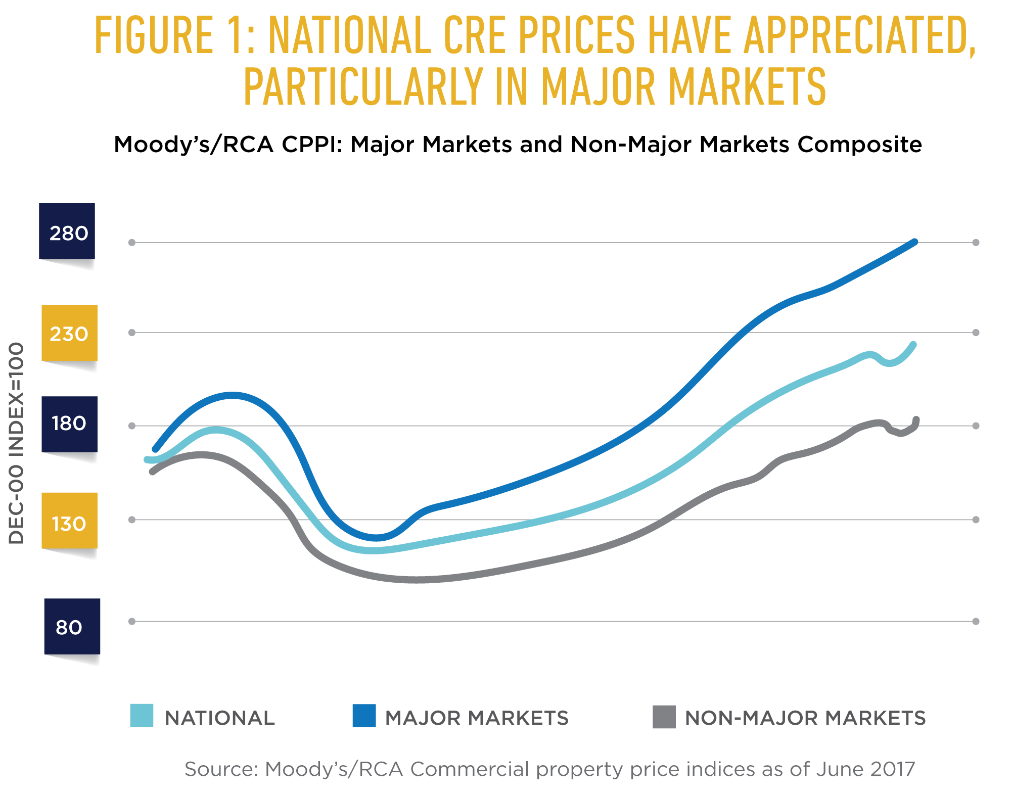U.S. CRE prices are now 26% above the previous market peak reached in November 2007 (not adjusted for inflation), and in recent years, we have seen consistent double-digit annual appreciation, according to Moody’s/RCA Commercial Property Price Indices (CPPI). The recovery, however, has been uneven. Real estate markets perceived as safer and more liquid have benefitted the most, largely due to strong capital inflows, as investors search for yield. So while prices in major CRE markets have increased by more than 45% since the peak, values in non-major markets where Blacklion will focus its investment activities, have risen only 11% (see Figure 1 below).
